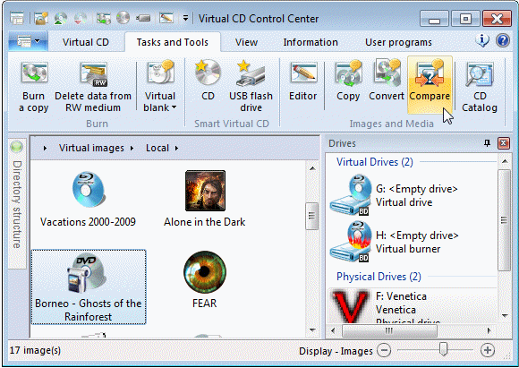 Open the CD Control Center and select the virtual CD that you wish to compare. Then open the Tasks and Tools tab and click on the Compare button.